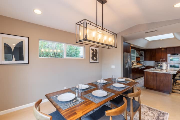 Situated in a tranquil oceanfront neighborhood, The Escape offers the perfect blend of beach accessibility and peaceful surroundings. Enjoy breathtaking Pacific Ocean sunsets from your private outdoor entertainment space, where palm trees sway in the gentle ocean breeze.